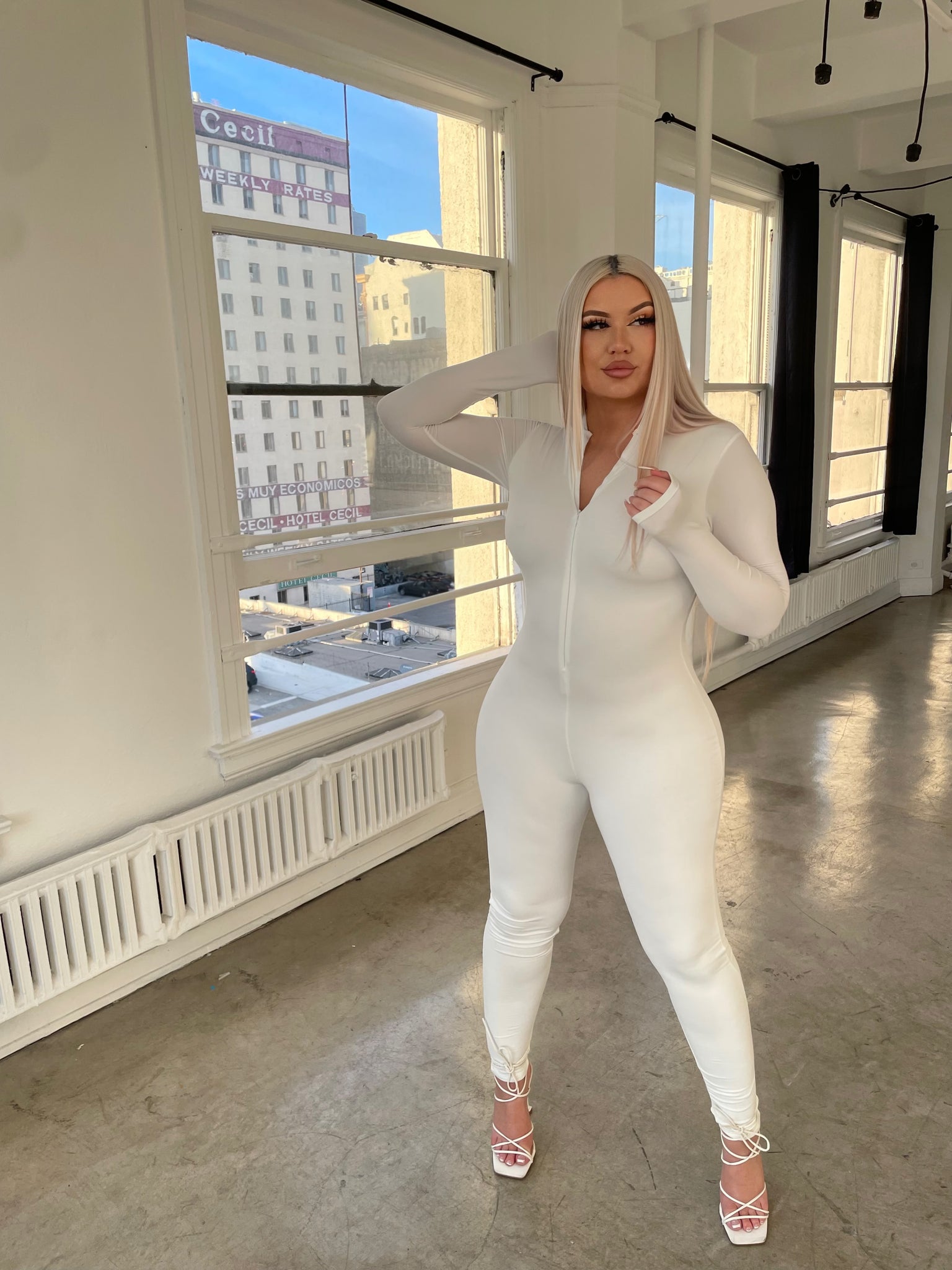 Double lined jumpsuit with front zipper stretchy, buttery soft material also available in bulk powder blue