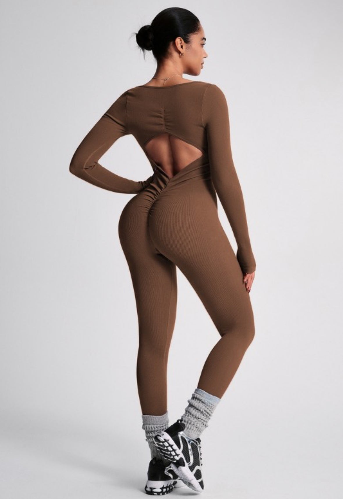 A stretchy ribbed jumpsuit with a sexy open back and sculpting ruched detailing that enhances every curve. Soft, flexible, and perfect for gym days, errands, or a casual-but-cute fit.