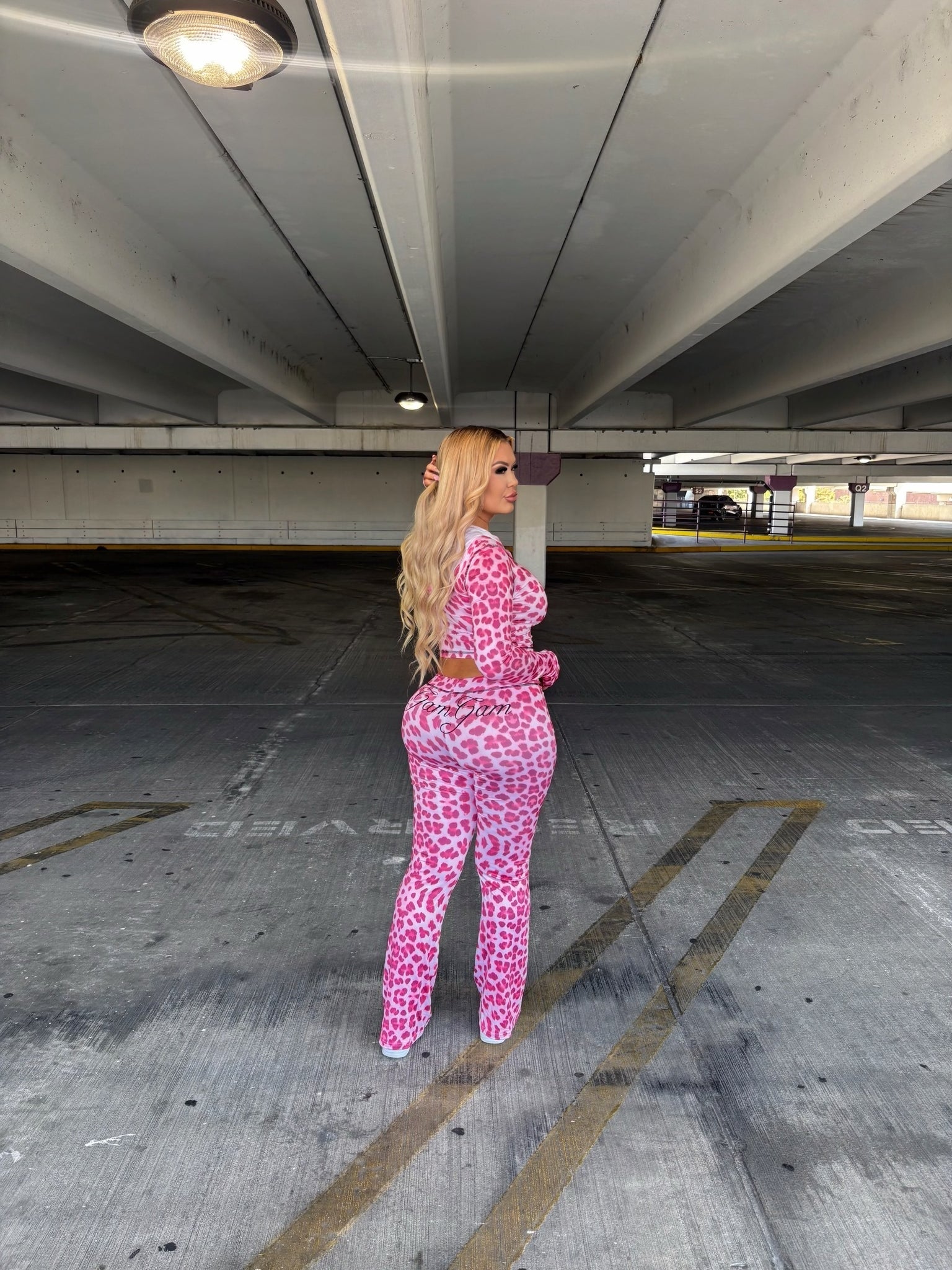 Step into your feline power with the Kiss Me Kitty Set. This two-piece stunner features a long-sleeve zip-up crop top and matching flared pants, drenched in a bold pink cheetah print that’s equal parts flirty and fierce. The curve-hugging fit was made to highlight your shape, while the playful “Honey Co” detail on the back adds a signature finishing touch.