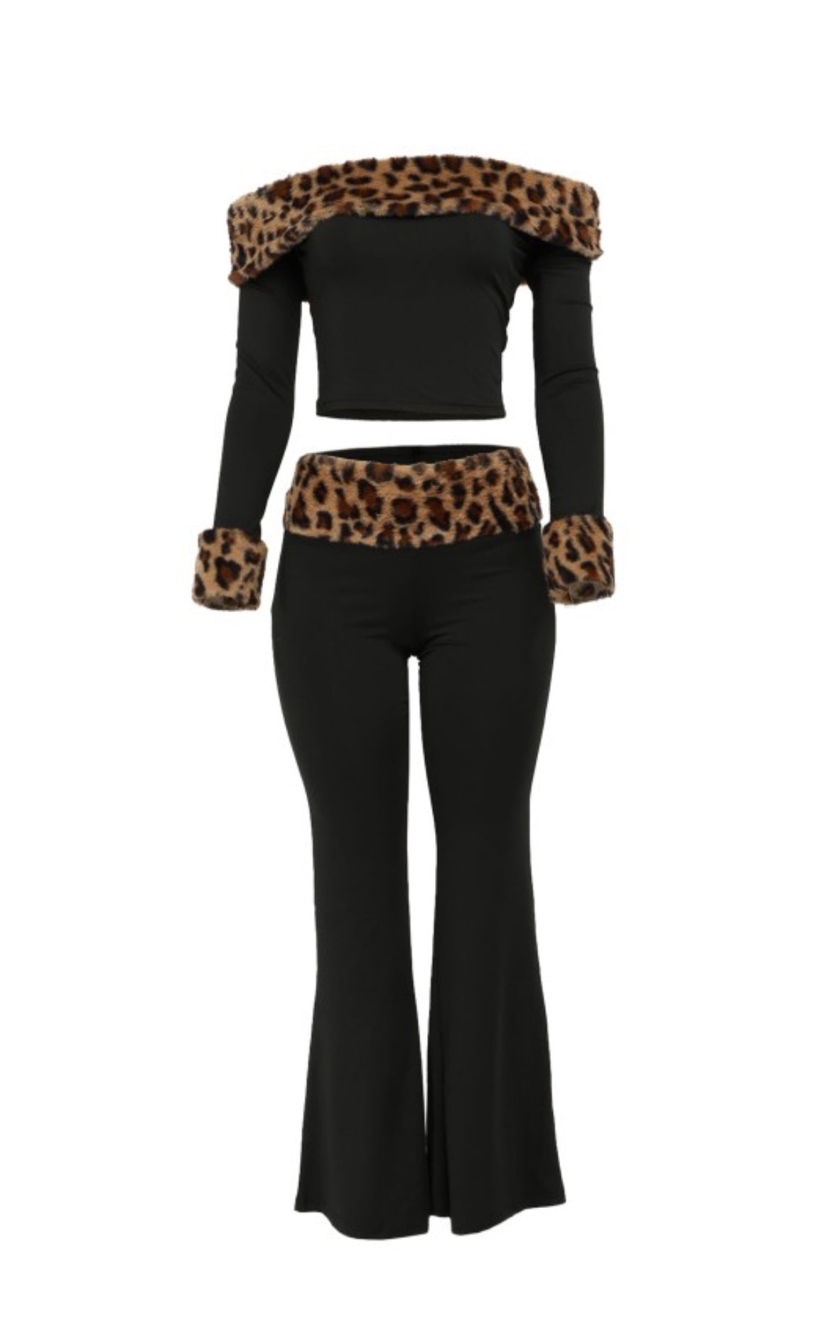 A soft, cozy 2-piece with faux-fur leopard trim for the perfect mix of cute and fierce. Off-shoulder crop top with matching flare pants that snatch the waist and give effortless Y2K winter vibes.