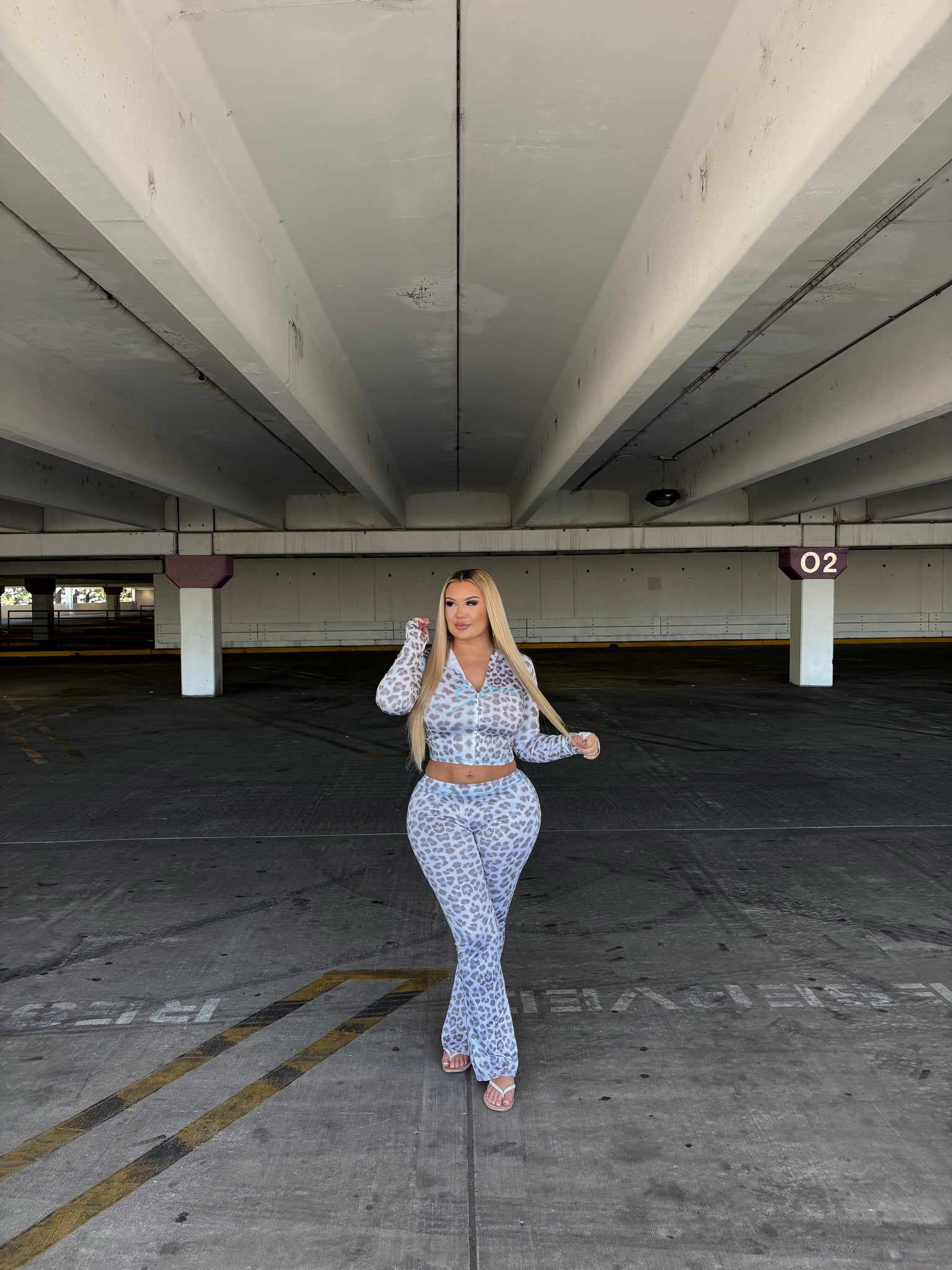 Unleash your wild side in the Moonlit Leopard Set, a two-piece outfit featuring a long-sleeve crop top and flared pants in a dreamy silver-grey leopard print. With its body-hugging fit and sheer stretch fabric, this set is equal parts sultry and stylish — perfect for nights out or making a statement wherever you go.
